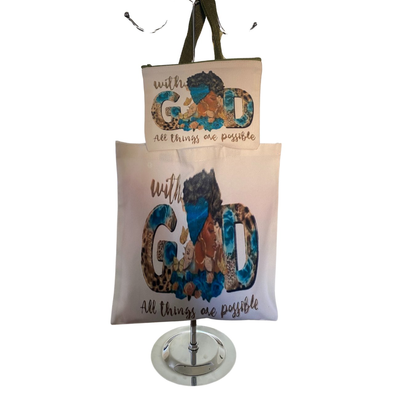 TMCraftyDesigns Tumbler + Matching Canvas Tote + Pouch – "With God All Things Are Possible"